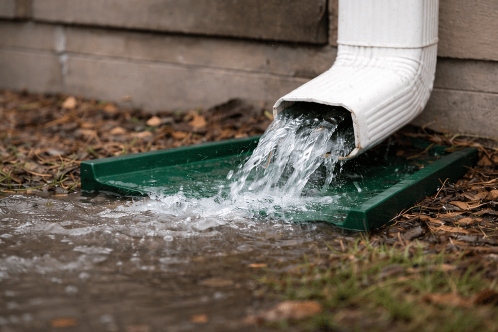 If it dumps water right next to the house, that’s a common foundation-zone risk. Ideally, water should discharge away from the foundation line. This is where downspout extensions and splash blocks can make a big difference, especially in areas where soil stays wet or where pooling occurs in spring.